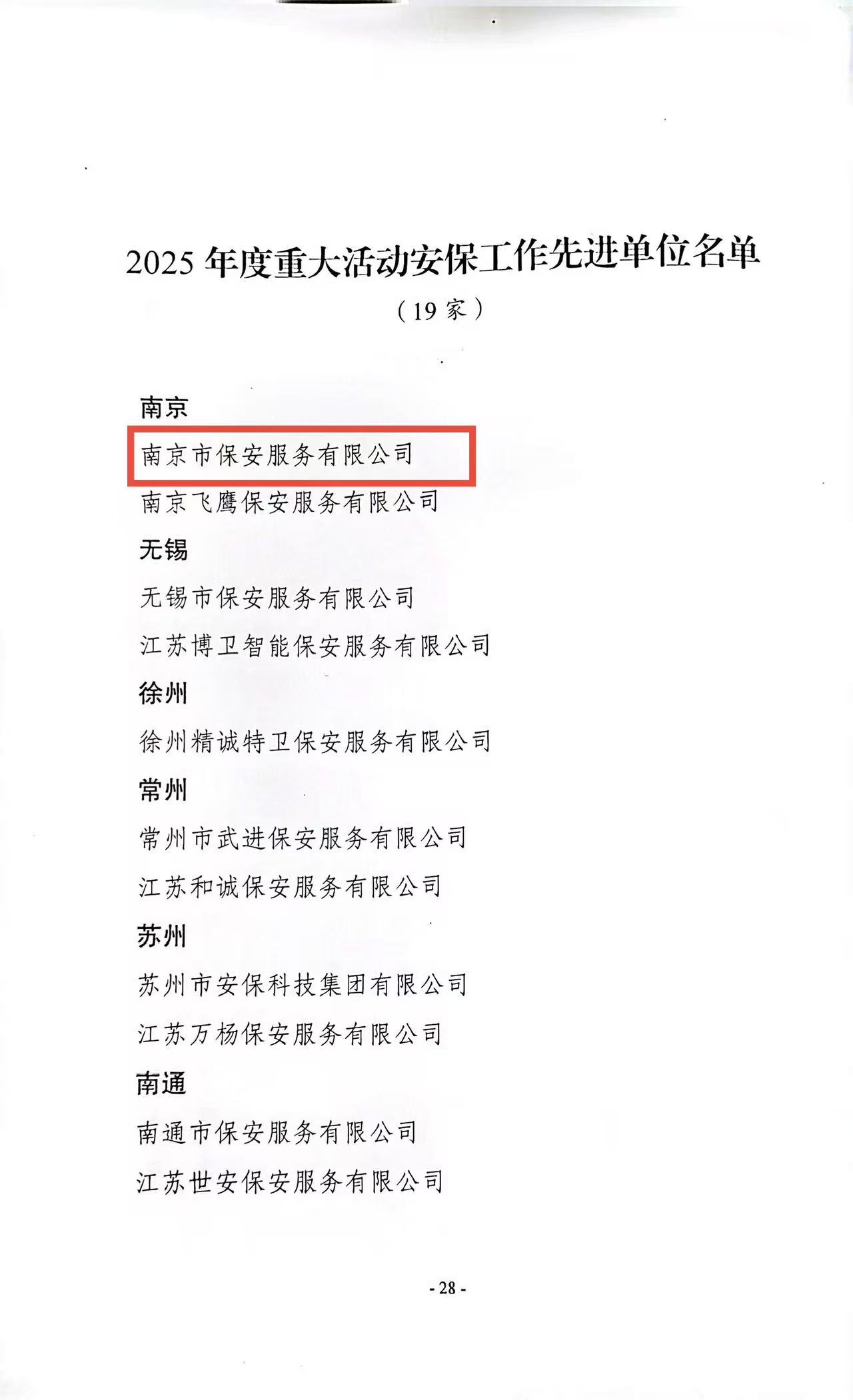 喜报!南京市保安服务有限公司荣获“2025年度重大活动安保工作先进单位”称号