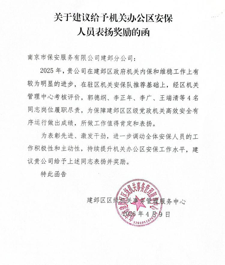 近日,建邺区区级机关事务管理服务中心发来通报函,对南京市保安服务有限公司建邺分公司(以下简称“建邺分公司”)驻区政府机关中队及郭德纲、李正年、李广、王端清4名同志予以通报表扬。作为守护区政府机关安全的重要力量,建邺分公司驻区政府机关中队在上级单位关心支持和监督指导下,始终坚守“安全第一、服务至上”的原则,严格落实安保执勤各项要求,全力筑牢驻点安全防线。