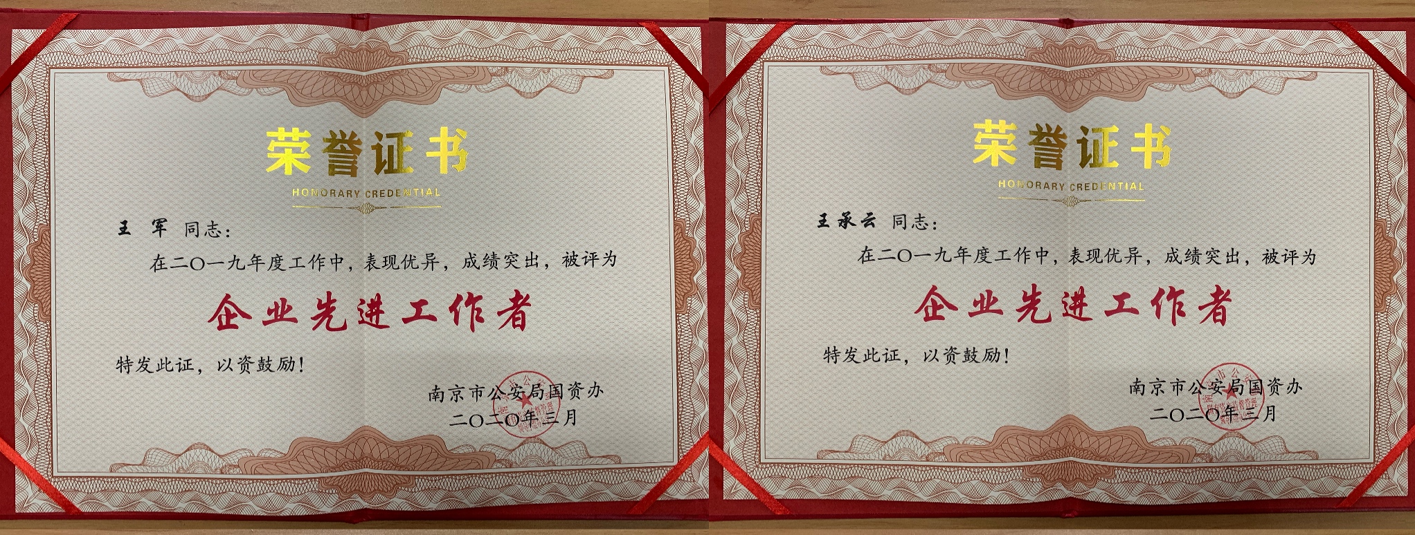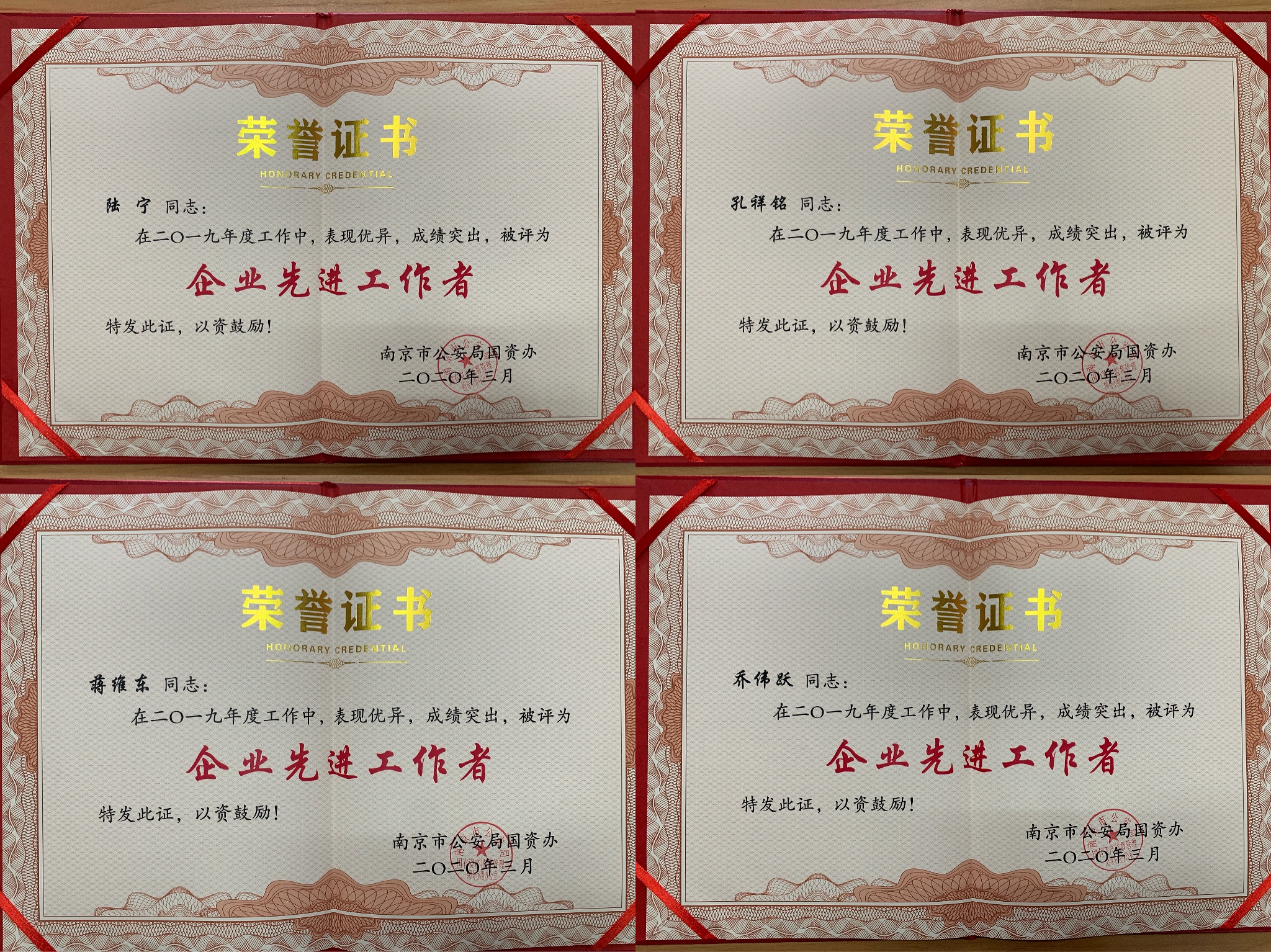 近日,南京市公安局国有资产监督管理领导小组办公室对在2019年度工作中表现优异的个人和集体进行表彰,南京市保安服务总公司总经理助理陆宁、安防部经理孔祥铭、雨花台区分公司经理蒋维东等10名同志,被评为“企业先进工作者”,南京市保安服务总公司金融安保部被评为“2019年度先进集体”。